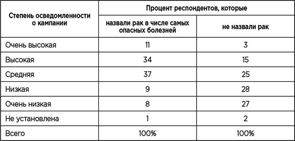 Центр исследования общественного мнения[64] сообщает об эксперименте, целью которого было оценить общественную осведомленность относительно одной из кампаний Американского общества борьбы с раком. Наряду с ответом на вопрос о том, что им известно о кампании по профилактике рака, респондентам предлагалось ответить, какие болезни они полагают наиболее опасными. В табл. 14 представлено соотношение между упоминанием онкологических заболеваний в числе наиболее опасных и степенью осведомленности относительно упомянутой кампании.