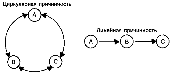 Каждая часть системы испытывает на себе воздействие других частей. В системах причины и следствия замыкаются в круг (А влияет на В и С, В влияет на С и А, С влияет на А и В), а не располагаются линейно (А влияет на В, которое влияет на С, которое влияет на …и т. д.). Это хорошо проиллюстрировано на рис. 2.1.