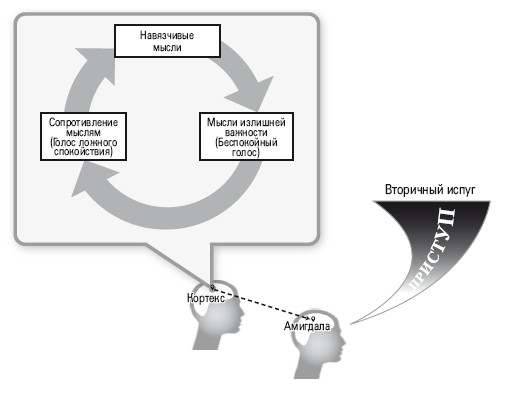 Предлагаем вам подробнее рассмотреть появление навязчивых мыслей на примере диалога внутренних голосов. Помните, что все три голоса (Беспокойный голос, Голос ложного спокойствия и Голос мудрости) соотносятся с той областью мозга, которая отвечает за мышление, то есть с корте-сом. Ни один из этих внутренних голосов не играет никакой роли в возникновении первого приступа страха – так называемого первого испуга.