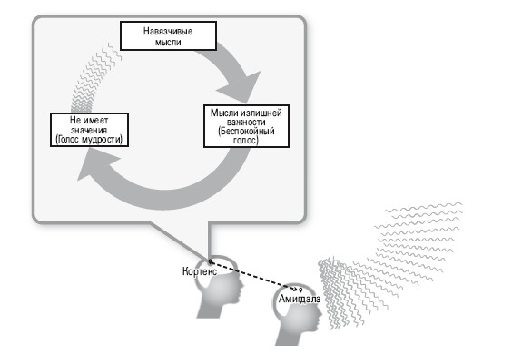 Голос мудрости в сознании – это голос кортекса, который утверждает, что исходная мысль «Что, если я спрыгну с балкона?» не представляет собой угрозы, несмотря на вызванный ею приступ страха. Голос мудрости сообщает, что первый испуг возникает автоматически, тогда как на вторичный страх вы можете повлиять. Голос мудрости объясняет, что чувство тревоги не означает присутствия реальной опасности. Когда это происходит, успокоение следует естественным образом, без дополнительных усилий, и навязчивые мысли растворяются в общем потоке других.