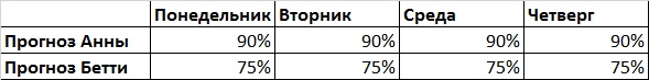 Внизу приведены два прогноза дождя на четыре дня, составленные Анной и Бетти: