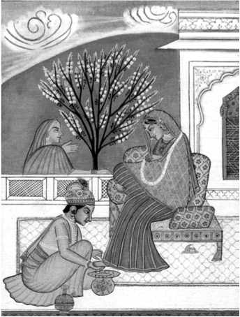 Пусть мужчина начнет объятия с верхней части ее тела, потому что так проще и спокойнее для девушки. Девушку, достигшую зрелости или знакомую ему, он обнимает, когда горит светильник; малознакомую или почти еще девочку – в темноте. Когда девушка освоится и примет объятия, должно вложить ей в рот лист бетеля с толченым орехом, а если она не примет подношения, то пусть мужчина упадет ей в ноги и ласковыми словами и клятвами уговорит взять угощение; даже стыдливая или разгневанная женщина уступает, когда мужчина у ее ног. Угощая молодую жену бетелем, мужчина нежно, осторожно и беззвучно целует ее в губы. Затем он вызывает девушку на разговор, притворяясь несведущим, и спрашивает ее о вещах, о которых, как он знает, можно рассказать в нескольких словах. Если же супруга не отвечает, пусть мужчина, не волнуя и не пугая ее, ласково, но настойчиво спрашивает вновь и вновь, будто бы ища совета. Если девушка все же молчит, он настаивает на ответе, ибо, как учит Гхотакамукха, «девушки всегда слышат слова, сказанные им мужчинами, но сами порой не хотят вымолвить ни слова». Если вопросы станут докучать ей, пусть девушка ответит движением головы; но если она в ссоре с мужчиной, то даже этого не нужно.