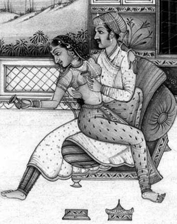 Во вторую и третью ночи, после того как доверие немного возросло, он исследует рукой все ее тело и целует ее всюду, кладет руку ей на бедро, гладит его и потом направляется к лону. Если она постарается удержать его руку, он говорит ей: «Что здесь дурного?» – и настаивает, чтобы она позволила ему продолжать. Добившись желаемого, супруг касается сокровенных мест девушки, распускает пояс или повязку на ее талии и, распахнув нижний край одежды, поглаживает ее бедра у лона. Главное – гладя и целуя девушку под различными предлогами, он не начинает самого соития; сначала разъясняет жене шестьдесят четыре вида любовного искусства, говорит, как сильно он ее любит, и описывает свои желания и мечты, посещающие его при мысли о жене. Он клянется в верности, рассеивает ее страхи перед соперницами и, наконец, поборов ее стыдливость, наслаждается супругой, не пугая и не приводя в смятение.