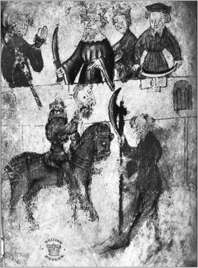 Ил. 52. Зеленый Рыцарь отрубает себе голову (чернила на пергаменте, Англия, 1375–1400 годы)