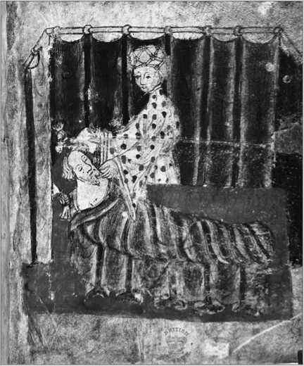 Ил. 53. Жена охотника и Гавейн (чернила на пергаменте, Англия, XIV век)