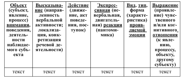 Инструкция. Наблюдение профессионально желательно осуществлять несколько раз (2–4 раза) подряд. Наблюдение осуществляется с фиксированными перерывами (промежутками) в течение полного дня жизнедеятельности субъекта или в течение нескольких часов (2–3 часа), находясь с ним в постоянном взаимодействии в процессе выполнения разнообразной деятельности. Наблюдателем должен являться только сам психолог, от лица которого и составляется протокол стандартизированного наблюдения. Протокол наблюдения, разработанный нами на основе многолетнего опыта, мы приводим в нижеследующей таблице.