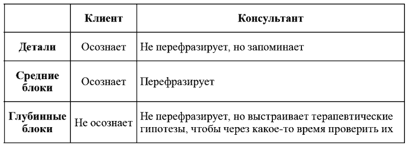 Глубинные блоки – не осознаваемые клиентом и имеющие сущностное значения для понимания его ситуации. А о чем на самом деле говорит клиентка? Какое послание содержится в ее словах? Говорит ли она о желании контролировать, опекать сына и о своих страхах? Глубинные блоки мы никогда не перефразируем, но берем эти идеи в качестве терапевтических гипотез.
