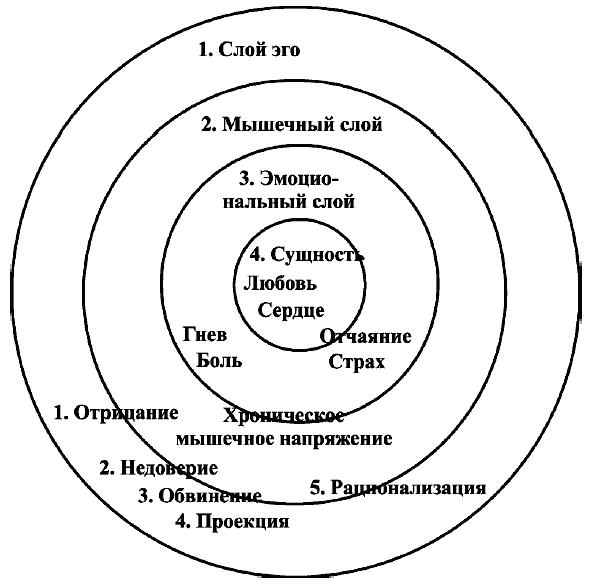 Слой эго, который содержит психическую защиту и является крайним слоем личности. Типичные защиты эго – это отрицание, недоверие, обвинение, проекция, рационализация, интеллектуализация и т. д.