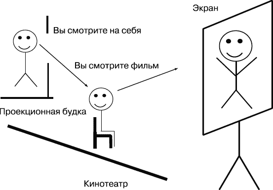 4. Затем пусть клиент еще раз диссоциируется от своего тела и переместится в воображаемую проекционную будку. Побудите клиента посмотреть из проекционной будки на себя, сидящего в кресле и смотрящего на свою черно-белую фотографию на экране. Клиент будет видеть спину теперешнего себя, смотрящего на более молодого себя на экране. Сделайте небольшую паузу, чтобы этот опыт двойной диссоциации закрепился.