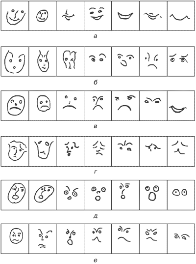 Рис. 18.3. Графические эталоны экспрессии: а – радости, б – удивления, в – презрения, г – страдания, д – страха, е – гнева.
