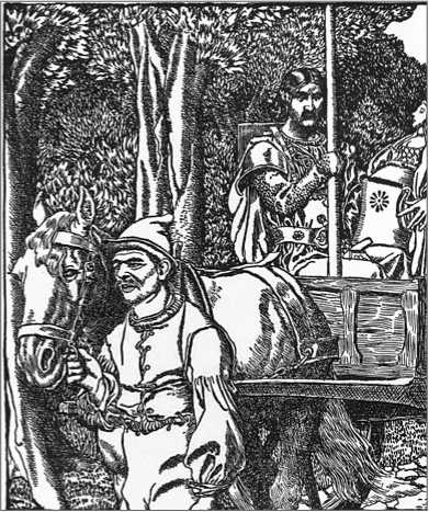 Сам Артур не отправляется на ее поиски; этим занимается Ланцелот. Он так спешит спасти ее, что загоняет двух коней до смерти. И теперь он бредет по дороге пешком в своих доспехах, продвигаясь довольно медленно. Вскоре с ним поравнялась деревенская телега, которой правил крестьянин. Увидев ее, Ланцелот подумал: «Вот бы мне поехать на этой телеге, тогда я бы смог быстрее добраться к Гвиневере». Но он озабочен тем, что это его опозорит и нанесет урон его репутации рыцаря. Он сделал еще три шага, сомневаясь, садиться в телегу или нет. Почему? Потому что человека в те времена везли на телеге или перед тем, как повесить, или перед каким-то другим наказанием. Ехать в телеге считалось позором. Но в конце концов он решился.