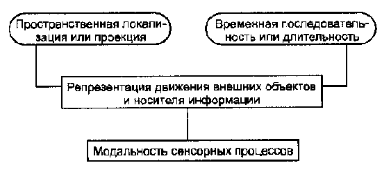 Все приведенные выше факты, характеризующие интрамодальную и интермодальную пространственновременную структуру сенсорных процессов, свидетельствуют в пользу положения об исходной роли отображения перемещений внешних объектов и самого организма и о том, что собственно пространственный компонент отображения локализации и собственно временные компоненты отражения последовательности и длительности являются производными и вытекают из единой пространственно-временной организации сенсорных образов движения (схема 3).