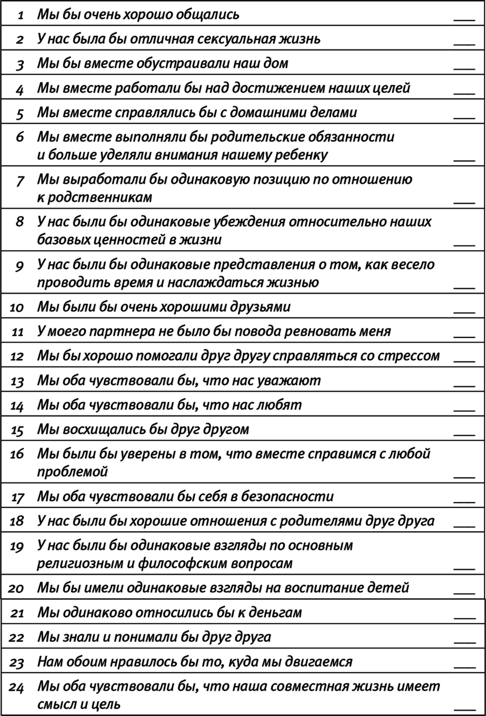 Независимо друг от друга заполните приведенную ниже таблицу. Прочтите утверждения. Поставьте напротив каждого из них цифру от 1 до 5 в зависимости от того, насколько сильно вам хотелось бы продвинуться в этом вопросе в сторону «мы» (1 – в этом вопросе у нас все отлично, и нам не нужно ничего делать; 2 – возможно, кое-что для продвижения в сторону «мы» сделать нужно; 3 – есть умеренная потребность двигаться в сторону «мы»; 4 – очень сильная потребность двигаться в сторону «мы»; 5 – чрезвычайно важно обеспечить сдвиг к «мы» в этом вопросе).