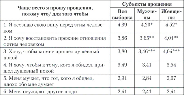 Сравнительный анализ оценки ситуаций, при которых может дароваться или искаться прощение, показал, что существует сходство между мужчинами и женщинами в оценке большинства ситуаций, за некоторым исключением. Женщины чаще, чем мужчины, даруют прощение, исходя из поиска психологического спокойствия и здоровья. По этой же причине женщины чаще, чем мужчины, ищут прощения. Кроме того, женщины чаще мужчин прощают людей под воздействием просьбы о прощении, а также когда сами испытывают вину из-за того, что обидчик переживает из-за проступка, и допускают, что другие имеют право на ошибку. В условиях же поиска прощения женщины чаще, чем мужчины, ищут прощения, чтобы восстановить прежние отношения с обиженным, и чаще, чем мужчины, просят прощения, потому что осознают вину перед обидчиком. В табл. 6.2 представлены средние значения оценок значимости причин и целей прощения со стороны обидчика.