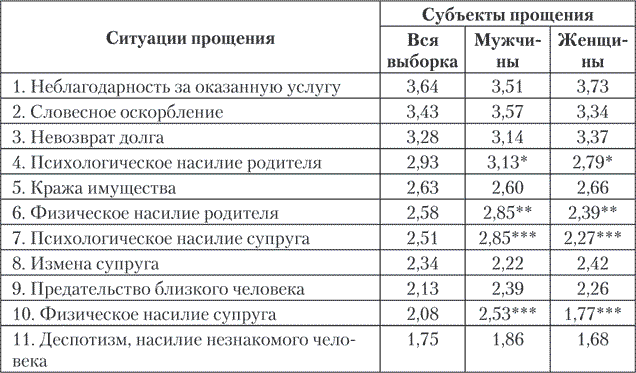 Таблица 6.3. Средние оценки возможности прощения в разных ситуациях