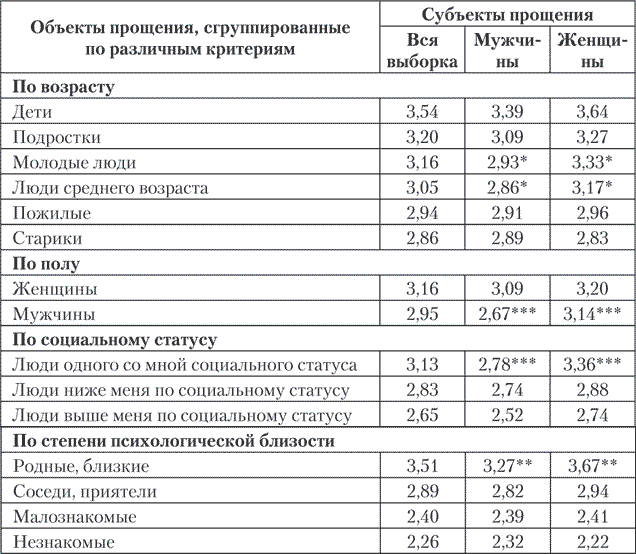 Таблица 6.4. Средние оценки частоты прощения объектов