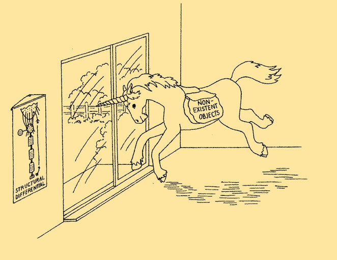 На стене кабинета Съюзан есть картина единорога, в месте, где раньше была раздвижная стеклянная дверь. На стене напротив, висит схема структурного дифференциала. Мы считаем, что эти структуры связаны с положительным время-связыванием. Единорог представляет так называемые ‘вещи’, которые не существуют, кроме как в символической форме; не смотря на это, мы можем поступать, будто они существуют, и отправляться на их поиски. Бывшая стеклянная дверь представляет вещи, которые существуют, но мы часто не замечаем их (именно поэтому на двери висел знак, чтобы мы не врезались в неё, думая, что она открыта, когда она была закрыта). Структурный дифференциал представляет систему общей семантики, которая помогает нам не врезаться в стеклянные двери и не искать единорогов в зоомагазинах. Используя ОС, мы можем наиболее эффективно использовать наш опыт, оценивая его адекватно, и меняя нашу оценку при необходимости.