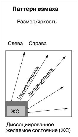 Г. «Создайте диссоциированную картину». Помните, что в НЛП вы ассоциируетесь с текущим и диссоциируетесь с желаемым состоянием. В ассоциированной картине вы уже имеете ощущение полученного желаемого результата. Таким образом, ассоциированная картина не будет мотивировать вас. Картина должна представлять собой привлекательный и желаемый образ. Чем более желанным кажется состояние, тем выше вероятность, что паттерн «Взмах» сработает.