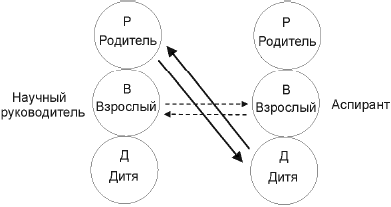 Ранее в этой главе приводился пример, когда жизненные пути научного руководителя и подчиненного разошлись тогда, когда исчерпали себя скрытые связи по линии В — В. Ясно, что связи по линии В — В это тоже скрытая трансакция. Напомним, что в том примере явное общение шло в рамках трансакции Р — Д, Д — Р (руководитель был опекуном, а подчиненный опекаемым), а скрытое общение шло по линии В — В (руководителю нужно, чтобы аспиранты выполняли работу, а аспирантам было нужно защитить диссертацию). Схема такого взаимодействия с учетом скрытой трансакции имеет вид, показанный на рис. 6.22.