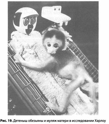 Но для Харлоу все было не так очевидно. Он брал детенышей макак-резусов и изолировал их от матери. Вместо нее он предлагал им выбор из двух искусственных «суррогатных» матерей (рис. 19). У одной псевдоматери была деревянная голова обезьяны, присоединенная к деревянному туловищу. В середине туловища была прикреплена бутылочка с молоком. Эта суррогатная мать «кормила» детенышей. У другой суррогатной матери были такая же голова и проволочное туловище. Но бутылочки с молоком не было, а ее фигура была обернута в мягкую махровую ткань. Бихевио- ристы и фрейдисты наверняка выбрали бы «мать», дающую молоко. Но не обезьяны — те выбирали «мать», обернутую в мягкую ткань. Оказалось, что дети любят маму не потому, что она помогает им сбалансированно питаться. Дети любят маму, потому что мама любит их, — по крайней мере, она мягкая и к ней можно прижаться. «Человеку нужно не только молоко. Любовь — это эмоция, а не бутылочка или ложечка для кормления», — писал Харлоу.
