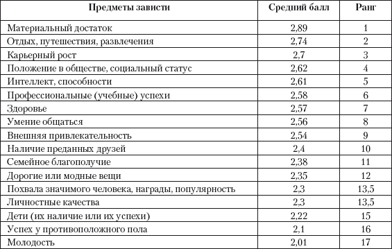 Полученные результаты дали основание автору выделить те предметы, зависть к которым наибольшая. Это материальный достаток, отдых (досуг), карьерный рост, социальный статус, интеллект (табл. 1.1).