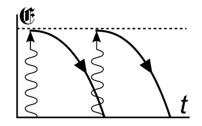 Посмотрим, как меняет потенциал одиночного свободного представления (4.3). Он очень медленно нарастает, достигает максимального значения, резко падает до нуля (происходит разрядка) – и весь цикл повторяется (рис. 5.3). Можно ли обратить время? Сделать разрядку медленной, а накопление быстрым и жестким? Попробуйте. Как вы потом будете психике в глаза смотреть? От удовольствия не осталось и следа.