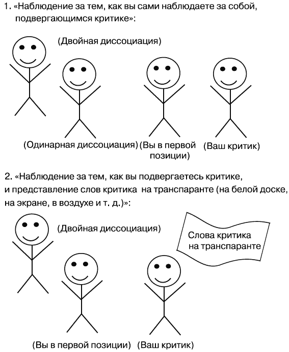 2. Диссоциируйтесь от критики, увидев, как вы подвергаетесь критике, находясь снаружи. Вы увидите, что находясь «снаружи» от вас самого, вы готовы справиться с тем, что вот-вот произойдет. Теперь взгляните со стороны на того, кто критикует вас, и представьте, что вы испытываете при этом сложности. Вам нужно увидеть себя в воображении немного раньше, чем человека, который критикует вас. Когда начнется критика, представьте, как вы «снаружи» незамедлительно диссоциируетесь. Попытайтесь мысленно увидеть, как еще один человек выходит из вас, того, который «снаружи». Теперь вы видите на картине двух себя. То есть вы оба смотрите на себя, подвергающегося критике. Таким образом, вы испытываете двойную диссоциацию. Я (Б. Б.) сталкиваюсь с затруднениями при двойной диссоциации, видя себя в двух экземплярах. Это вводит меня в слишком глубокий транс, что не позволяет мне действовать осознанно. Другие студенты отмечают такую же сложность. К счастью, этот метод допускает другой вариант. Итак, осуществите двойную диссоциацию следующим образом: диссоциируйтесь однократно (то есть вообразите одного себя на картине) и затем представьте слова критики, напечатанные в воздухе или на воображаемой классной доске.