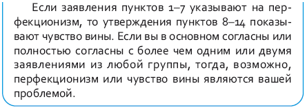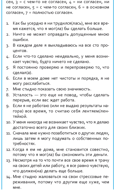 Грег и Стейси были перфекционистами[114]. Они приложили массу усилий, чтобы, выдержав большой конкурс, поступить в университет и добиться успеха в предпринимательской деятельности. Они привыкли все делать правильно, то есть следить за своим здоровьем, быть опрятными и собранными, держать все под контролем, экономить деньги и выстраивать идеальные взаимоотношения. Когда в их жизни появились дети, у них уже не было возможности делать все на отлично. Однако они, вместо того чтобы скорректировать свои ожидания и начать давать себе передышку, по-прежнему ожидали совершенства как от себя, так и друг от друга, что умножало их стрессовые переживания и чувство вины. Перфекционизм и ложное чувство вины – это проклятье под личиной благословения. То и другое будут все время возбуждать вашу миндалину, давая понять, что вы недостаточно стараетесь. Для того чтобы защитить свой мозг от стресса, вам нужно избавиться и от перфекционизма, и от чувства вины. Используйте нижеследующий тест, чтобы выяснить, свойственны ли вам чувство вины и перфекционизм.