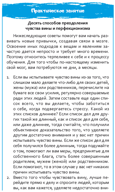 Перфекционизм бесполезен в условиях стресса, то же самое верно и для чувства вины. Чувство вины представляет собой эмоцию, которая у нас зачастую развивается в детстве, когда те, кто занимался нашим воспитанием, говорили нам: «Съешь все до последней крошки, в Индии люди голодают» или «Я работаю не покладая рук, чтобы у тебя все было, а ты вздумал жаловаться?» Повзрослев, мы продолжаем носить в себе эти внушения и в глубине души считаем, что никогда не сможем сделать столько, сколько нужно. Стресс может вызвать чувство вины, потому что вам не хватает времени на выполнение всего задуманного. Возможно, нам придется выбирать между достижением своих целей или оказанием услуг других людям. Нам становится сложнее заниматься физическими упражнениями и поддерживать здоровый образ жизни. Другие виды стрессоров, такие как распад отношений или необходимость отстраниться от кого-то, чье поведение вредит нам, могут заставить нас испытывать чувство вины, потому что этого человека может расстроить наше решение.