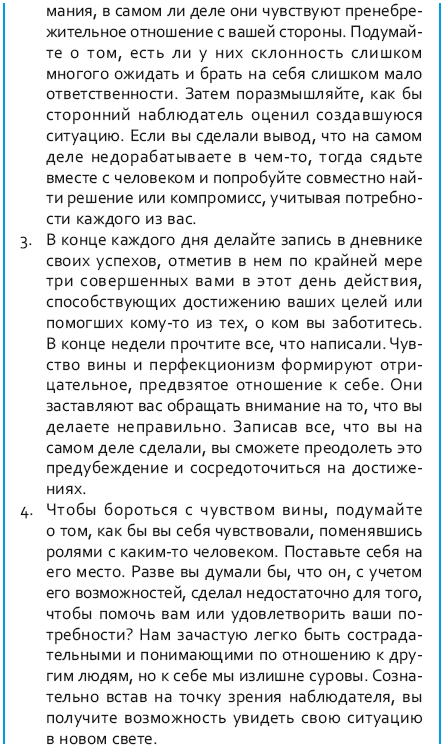 Наша культура строго наставляет нас воздерживаться от себялюбия и потакания своим слабостям. К сожалению, люди ошибочно истолковывают эти установки как категоричный запрет. Если вы солгали тому, о ком заботитесь, или поступили эгоистично, обидев кого-то, тогда чувство вины может побудить вас перестать совершать действия оскорбительного характера и исправить свое поведение (Крайдер[119], Спрингер [120] и Моруэдж[121], 2012). Таким образом вы, скорее всего, улучшите свои взаимоотношения и самооценку. Следует полагать, что и многие другие проявления чувства вины не принесут вам никакой пользы, а лишь заставят испытывать более сильное нервно-психическое напряжение. В стрессовом же состоянии вы, конечно, не нуждаетесь в дополнительном бремени в виде бесполезного чувства вины!
