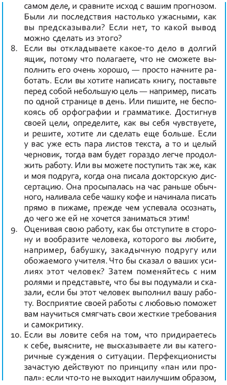 Хотя перфекционизм – это попытка справиться со стрессом посредством сохранения контроля, он часто приводит к неприятным последствиям. Перфекционизм может вести к сомнениям в правильности своих действий, откладыванию дел в долгий ящик, обескураженности или отказу от дальнейших попыток. Он также может быть опасным для ума и тела. Так, в статье из журнала Review of General Psychology[115] (Флетт[116], Хьюитт[117] и Хейсель[118], 2014) сообщается, что перфекционисты чаще других склонны сталкиваться с депрессией и тревожностью, а также совершать самоубийство. У перфекционистов также чаще диагностируют синдром хронической усталости и хроническую боль.