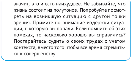 Перфекционизм и чувство вины лишь усугубляют стрессовые переживания и в без того непростой ситуации. Вместо того чтобы успокоить миндалину, они ее возбуждают. Может быть, вы являетесь самым непримиримым критиком себя? Разве вы ничего не делаете для того, чтобы соответствовать собственным нормам? Перфекционизм может быть результатом жесткой установки, когда вы не корректируете свои ожидания, чтобы они соответствовали ситуации. Подумайте о Греге и Стейси, которые хотели быть прекрасными родителями и супругами, но в итоге лишь столкнулись со стрессом и стали плохо думать о себе. Самооценка перфекционистов условна, они верят в то, что могут нравиться окружающим, только если им сопутствует успех. Но в стрессовых условиях нам нужно корректировать наши нормы и ожидания. Иногда, когда на нас сыплются беды и неприятности, достаточно просто выкарабкаться. Перфекционисты зачастую чувствуют себя самозванцами или мошенниками и живут в постоянном страхе перед разоблачением их некомпетентности. Возможно, именно поэтому они столь самокритичны и требовательны к себе. Стрессовые обстоятельства, когда мы изо всех сил стараемся удержаться на плаву, могут усилить перфекционизм.