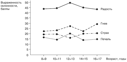 Возрастная динамика склонности к проявлению базовых эмоций. Данные, полученные М. С. Пономаревой (Е. П. Ильин, М. С. Пономарева, 2001) при опросе школьников, показывают, что во всех возрастных группах склонность к проявлению радости явно преобладает над склонностью к проявлению гнева, страха и печали (рис. 16.2). Склонность к гневу выражена несколько больше, чем склонность к страху и печали, а склонность к печали выражена меньше всего.
