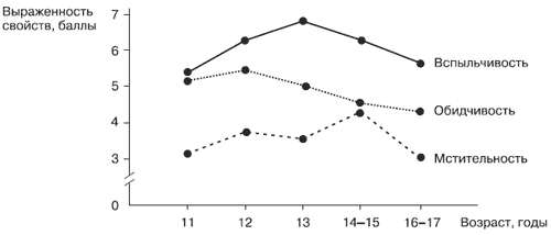 Самооценка вспыльчивости выше всего была у школьников 13 лет, обидчивости – у школьников 12 лет, а мстительности – у школьников 14—15 лет.