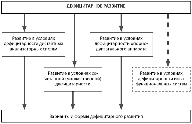 В рамках дефицитарного типа развития в соответствии с имеющейся в коррекционной педагогике и специальной психологии классификацией выделяют детей с отклонениями в формировании сенсорных (в первую очередь слуховой и зрительной) и двигательных (особенности функционирования опорно-двигательного аппарата) функций. В отдельный вид дефицитарного развития имеет смысл выделить детей с сочетанными (множественными) нарушениями (сложным дефектом), когда эти отклонения присутствуют в различных сочетаниях, иногда с присоединением дисфункций других психических и соматических систем ребенка.