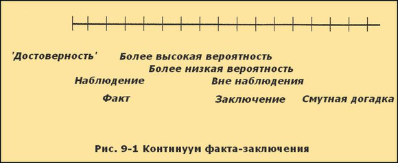 Поэтому когда мы отличаем факты от заключений, мы говорим о степенях вероятности. Как отличить близость к достоверности констатации факта от степеней вероятности заключающего утверждения? В абсолютном смысле, никак. Поэтому, как предложил Кеннет Джонсон, мы предпочитаем рассматривать эти процессы в континууме, а не в чётких категориях. Континуум выглядит следующим образом.