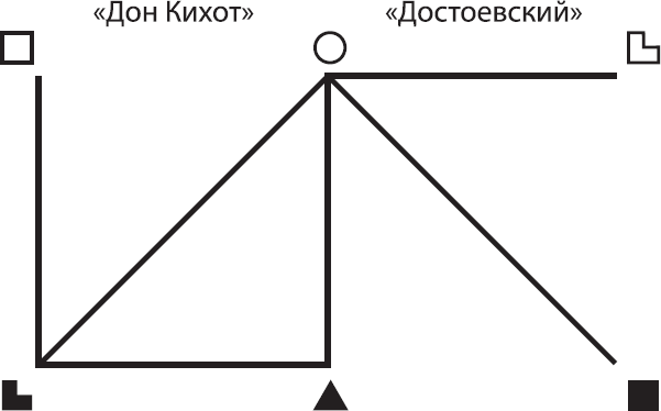 Творчество «Достоевского» в области, определяемой объектной интуицией, подвергает область самоутверждения «Дон Кихота» постоянной проверке на прочность: «контролер» полностью блокирует аспект организации чужого типа ИМ. В результате «Дон Кихот» начинает испытывать бессознательное чувство неуверенности.