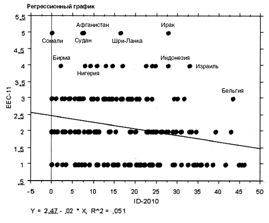 Рисунок 4.3 иллюстрирует очень слабую отрицательную связь между ИД-2010 и УЭК (r = -0,225). В странах, расположившихся выше линии регрессии, оценки уровня этнических конфликтов превышают ожидаемые на основании регрессионного уравнения, а в странах, расположившихся ниже линии регрессии, они ниже ожидаемых. Некоторые из наиболее отклоняющихся стран поименованы на рисунке. Рисунок 4.3 показывает, что спрогнозировать уровень УЭК со сколько-нибудь приемлемой точностью на основании ИД-2010 невозможно. Низкие и высокие значения УЭК почти одинаково возможны при всех уровнях демократизации. Однако результаты все же могут быть интерпретированы как поддерживающие «перевернутую U-гипотезу», хотя и в незначительной мере. При наивысших значениях ИД (выше 30) только в очень небольшом числе стран УЭК поднимался до уровня 3 или выше.