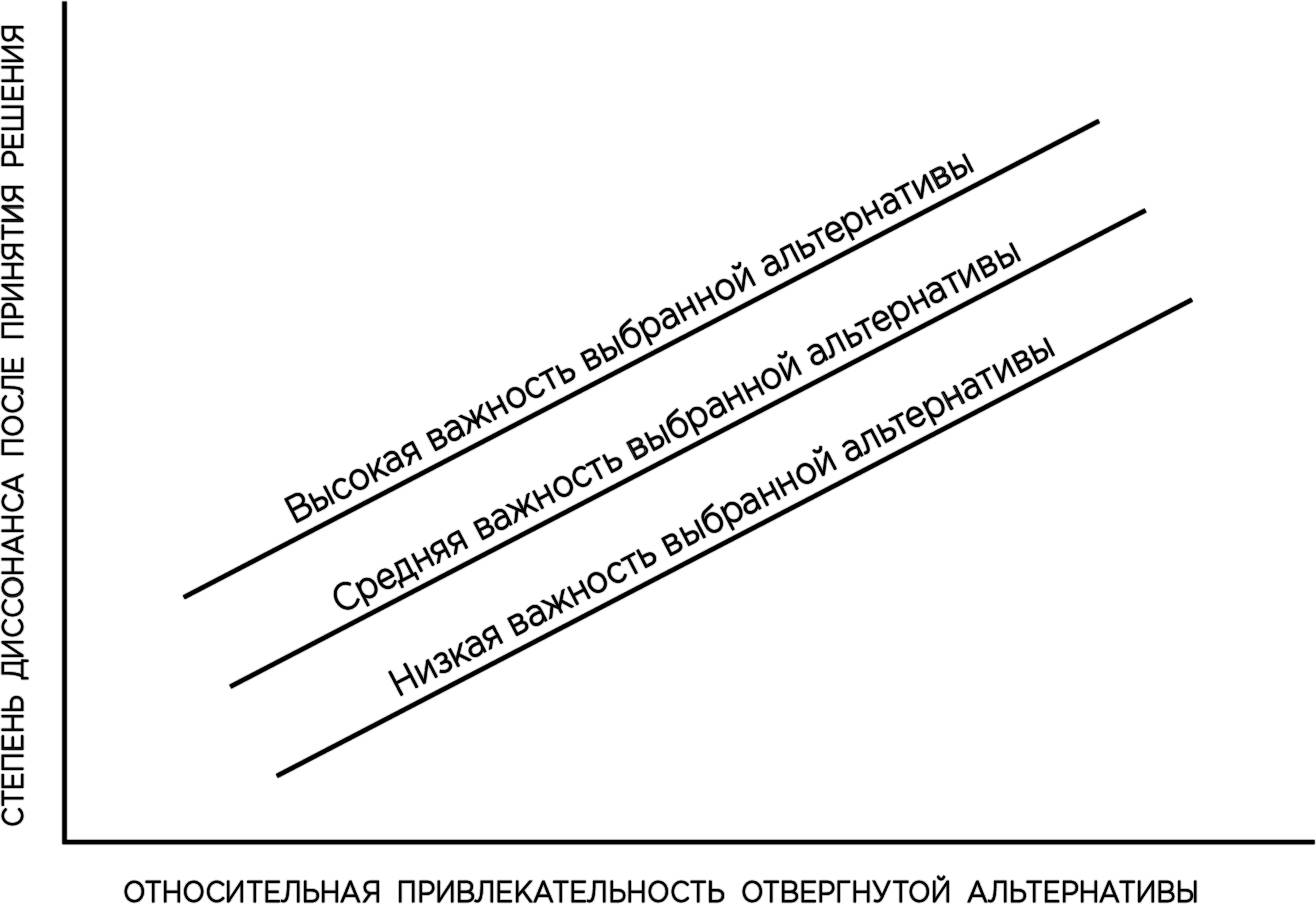На рис. 1 показан характер зависимости, которая существует между степенью диссонанса, возникающего после принятия решения, и величиной относительной привлекательности отвергнутой альтернативы (принимая, что важность и привлекательность выбранной альтернативы остаются неизменными). Для любой данной относительной привлекательности отвергнутой альтернативы верно следующее: чем больше важность принятого решения или привлекательность выбранной альтернативы, тем большим будет возникающий в результате диссонанс.