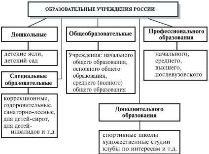 Российская образовательная система – это, прежде всего, сеть образовательных учреждений, обеспечивающих получение населением образования (рис. 20). По своим организационно-правовым формам образовательные учреждения могут быть: