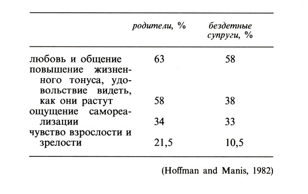 Однако с детьми связаны и положительные стороны жизни. Исследование, проведенное Хоффманном и Манисом (1982), было посвящено изучению ответов людей на вопрос, какое место в их жизни занимают дети. Результаты этого исследования приведены в следующей таблице. Большинство людей считают, что дети повышают прочность брака (Veroff, Douvan and Kulka, 1981), хотя имеющиеся данные свидетельствуют о противоположном. После 50 лет, при отсутствии детей в возрасте до 18 лет, не существует разницы в ощущении счастья между теми, кто имеет детей и кто не имеет их (Glenn and Mclanahan, 1981).