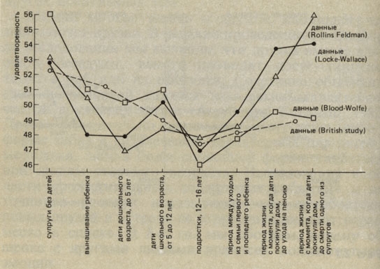 Рис. 2.2. Супружеская удовлетворенность и цикл семейной жизни. (Walker, 1977)