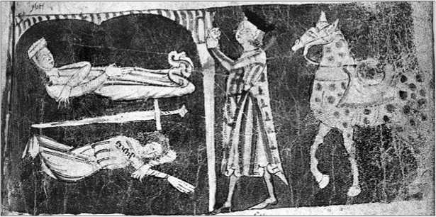 Ил. 39. Тристан и Изольда спят, разделенные мечом (чернила на пергаменте, Германия, XIII век)
