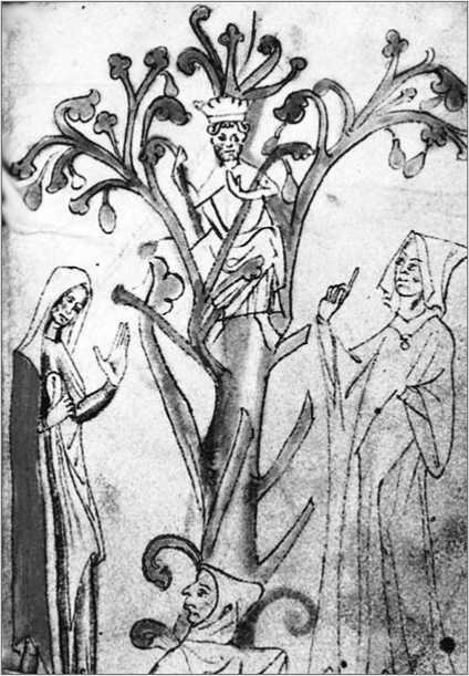 Ил. 40. Король Марк и Мелот выслеживают Тристана и Изольду (чернила на пергаменте, Англия, XIV век)