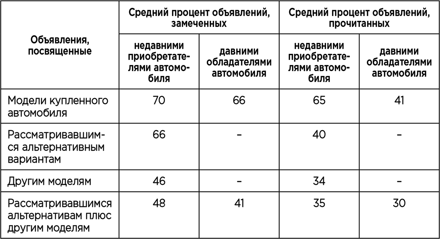Более высокая чувствительность к рекламе автомобилей у недавних приобретателей машины хорошо заметна при сравнении их с давними обладателями автомобиля. Они заметили и прочитали большее количество рекламных объявлений об автомобилях всех типов. Наибольшее различие между этими двумя группами, однако, состоит в том, с какой частотой они читают объявления, посвященные той модели автомобиля, которой они владеют. В полном соответствии с предсказаниями теории, недавние владельцы автомобилей по сравнению с владельцами со стажем читают значительно большее количество рекламных объявлений о марке своего автомобиля (60 % и 41 % соответственно).