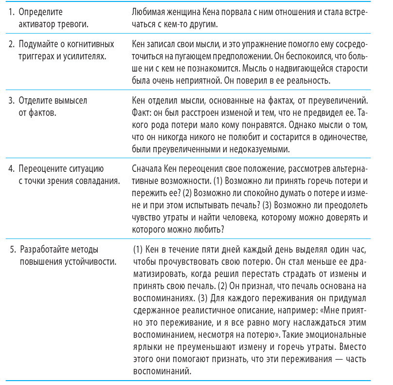 Клиент по имени Кен страдал от тревоги после того, как с ним рассталась его давняя подруга. Кен чувствовал себя опустошенным и подавленным этой потерей. Он беспокоился, что никогда никого не сможет полюбить. Он использовал пятишаговый метакогнитивный подход, чтобы нейтрализовать тревогу, вызванную этой потерей, и освободиться от ненужных страданий.