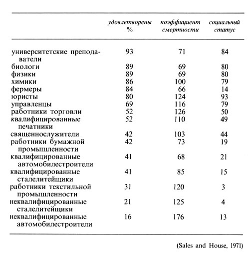 Показатели "социального статуса" базируются на социологическом индексе статуса различных профессий. Из таблицы видно, например, что смертность от сердечно-сосудистых заболеваний коррелирует с низкой удовлетворенностью работой; величина корреляции колеблется в пределах от 0,6 до 0,7. Частично это вызвано влиянием социального статуса (более высокий статус ассоциируется с получением более высокого удовлетворения от работы и более низким коэффициентом заболеваний сердца). Однако если социальный статус принять за постоянную величину, все равно будет наблюдаться сильная зависимость между неудовлетворенностью и сердечно-сосудистыми заболеваниями (Sales and House, 1971)