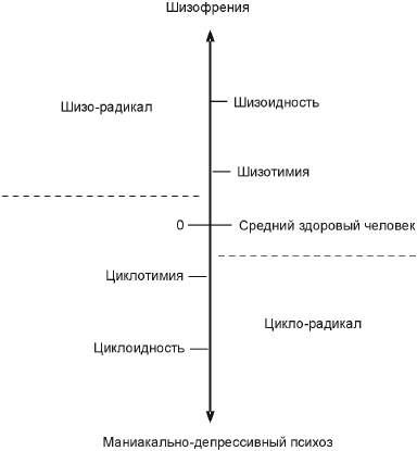 Если от нуля идти вниз по шкале, то нам встретятся циклотимик и циклоид соответственно, носители цикло-радикалов. Степени отличия между циклотимиками и ними точно такие же, как между шизотимиками и шизоидами. Циклотимик — здоровый человек, в темпераменте которого уже можно проследить шизо-радикала. Циклоид уже ближе к грани, хотя, как и в случае с шизоидом, к болезни не имеет никакого отношения. Но при неблагоприятном развитии ситуации шансов заболеть у него больше, чем у того же циклотимика, и тем более чем у тех, кто в районе нуля. И заболеет циклоид, если ему это суждено, маниакально-депрессивным психозом.