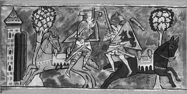 Ил. 26. Парцифаль и Фейерфис сражаются (чернила на пергаменте, Германия, XIII век)
