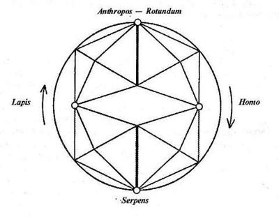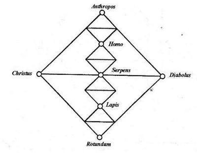 Такое расположение демонстрирует, с одной стороны, более сильную напряженность между anthropos-rotundum и serpens, а. с другой — меньшую напряженность между homo и lapis, что объясняется расстоянием, отделяющим друг от друга соответствующие точки. Стрелками показан путь вниз, в Физис, и вверх, к духовному. В самой нижней точке находится змея. Однако lapis, несмотря на его определенно материальную природу, является также и духовным символом, тогда как rotundum обозначает трансцендентную сущность, символизируемую тайной материи и, таким образом, сопоставимую с понятием атома. Антиномическое развитие понятий согласовывается с парадоксальной природой алхимии.
